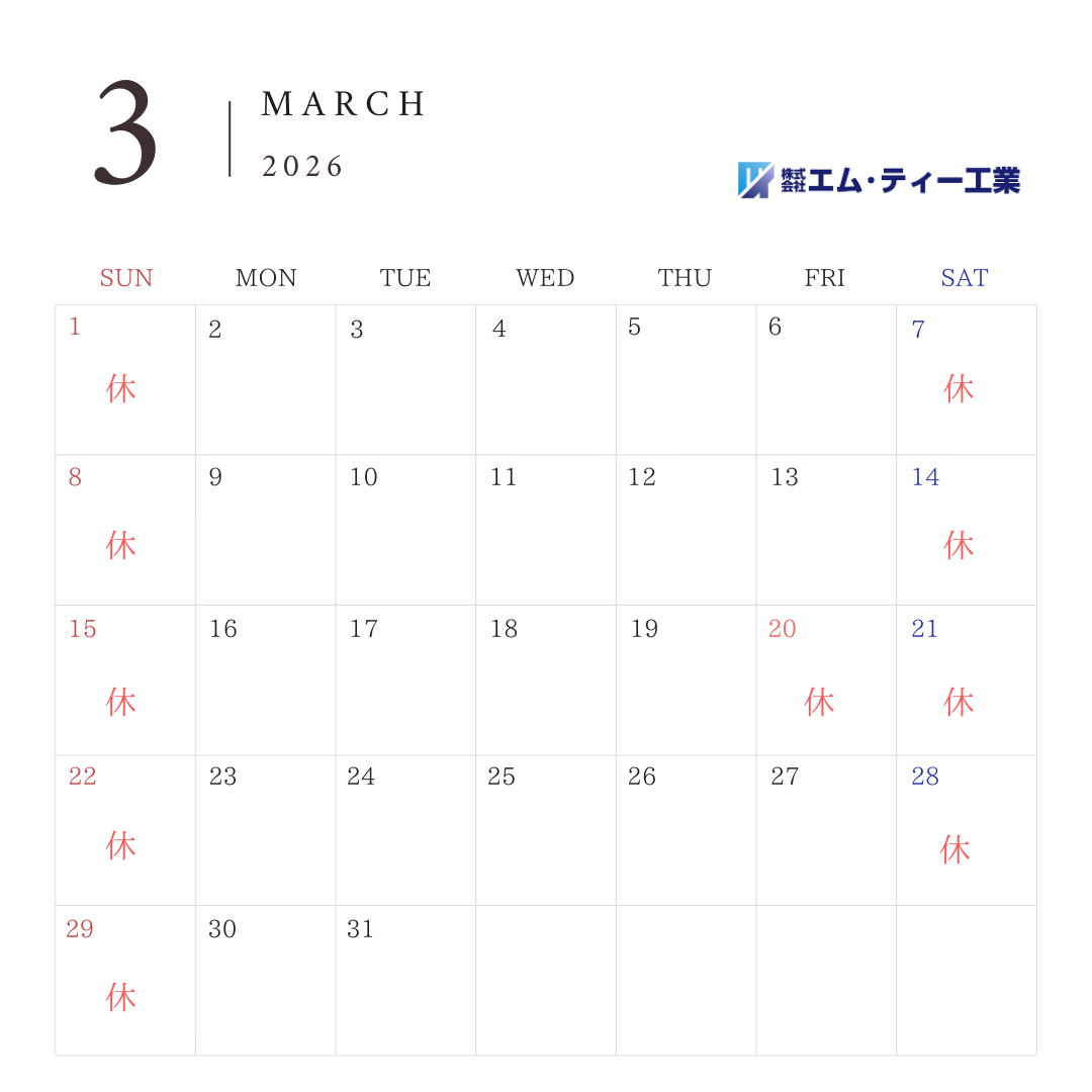 3月営業日 お知らせ 2026年2月27日2026年2月27日 お知らせ 0 Comments by m.tkougyous Facebook X / Twitter Pinterest Previous Post